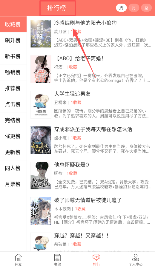 2、想找热门作品,就点底部的“排行”按钮。这里分类非常详细,有收藏榜、飙升榜、新书榜等等。