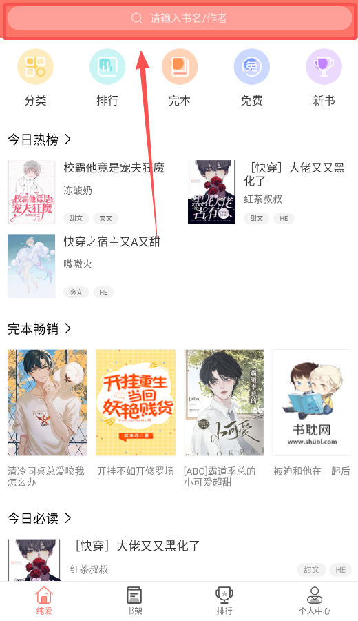 3、在“书城”首页,顶部有搜索框,可以直接输入书名或作者查找。