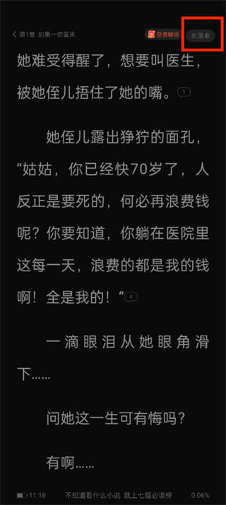 2、然后在看小说的页面中我们点击页面右上角的【菜单】按钮;