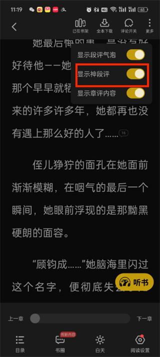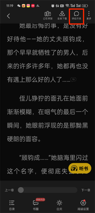 1、在小说阅读页,若不想看文字想听讲书,点击页面右侧的【听】按钮,就能进入听书模式啦。