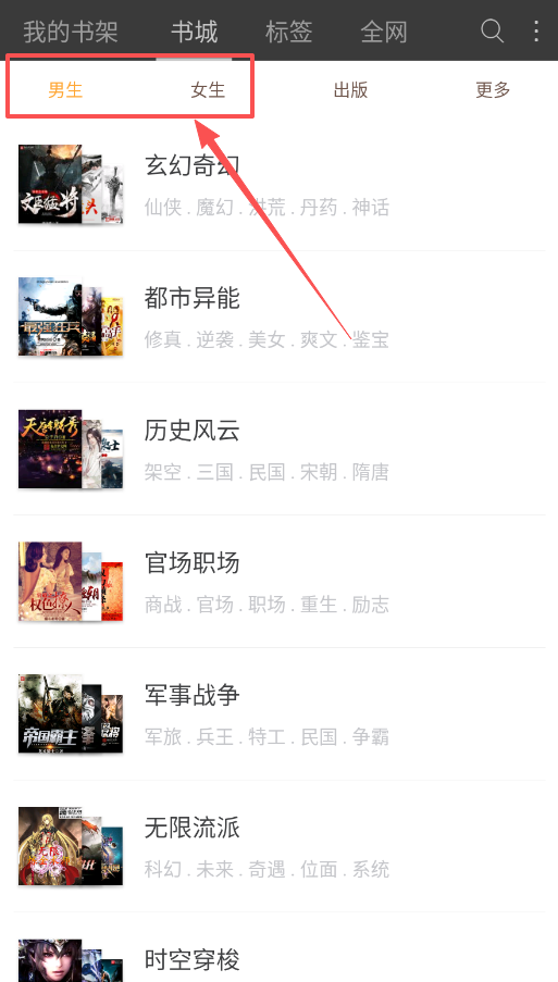 1、“男生、女生、出版”等大类分好,下面还有玄幻、都市等详细分类,方便你按兴趣挑选。
