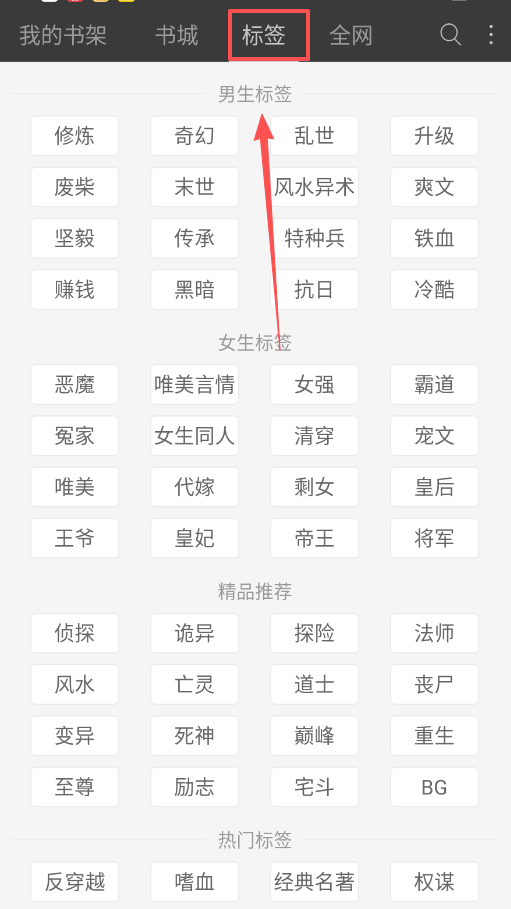 2、如果你想更精准地找书,可以点开“标签”页,那里有海量细分标签,分男生、女生、精品和热门。