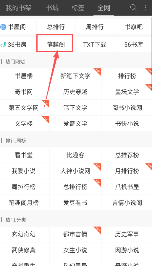 3、在“全网”页面里,软件聚合了许多热门小说网站和资源站,比如笔趣阁、奇书网等,还有各类排行榜。