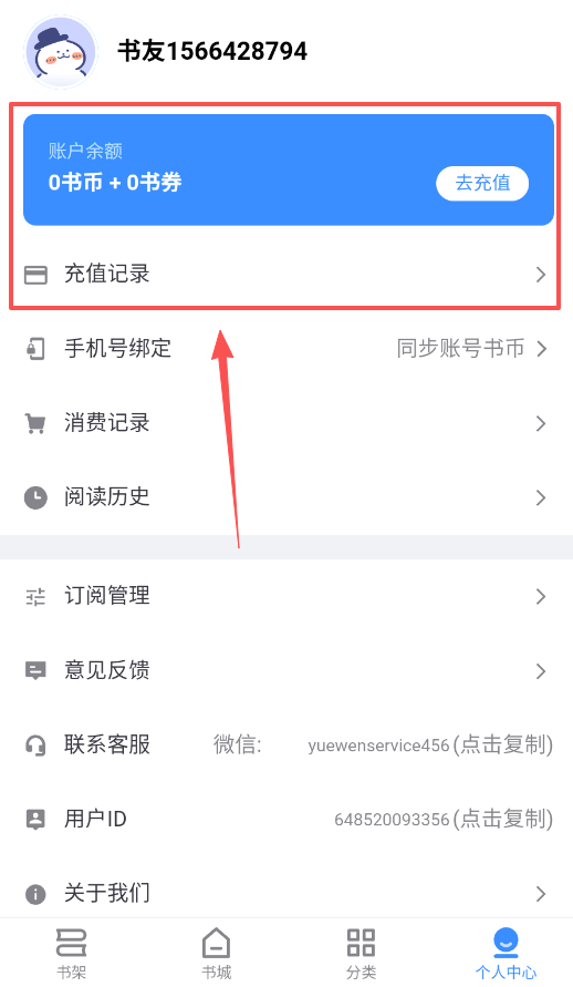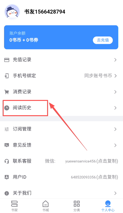 4、个人中心是个多功能区,阅读历史帮你找回读过的书,客服微信和意见反馈通道则在你需要帮助时能用上。