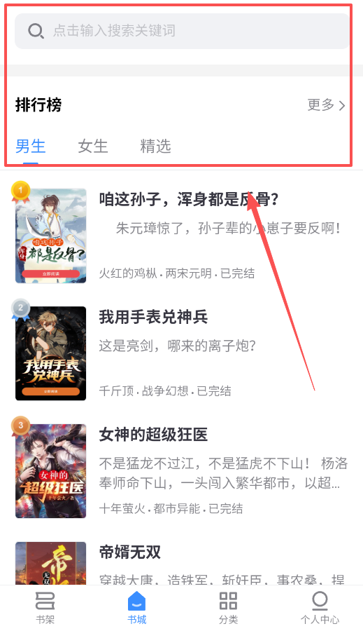 2、找书有两种路径:一是直接搜索关键词,二是在书城利用分类和排行榜进行浏览与筛选。