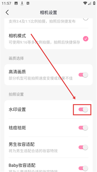 4、在相机设置页找到【水印设置】开关,点击就能开启或关闭拍照时的水印效果,超方便哦。