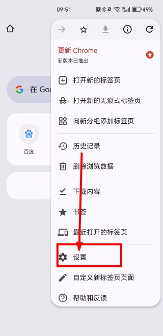 1.运行谷歌浏览器后,找到“设置”选项并打开;
