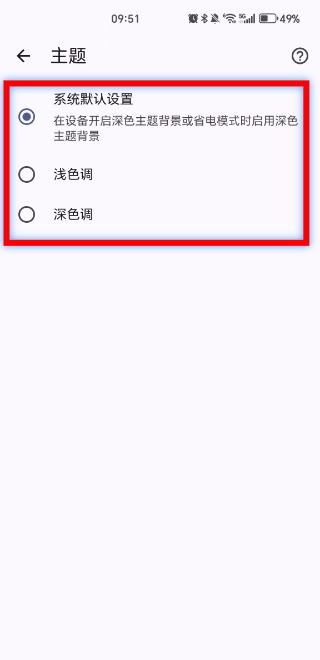 4、在【主题】页面,提供【系统默认设置】【浅色调】【深色调】三种选项,可根据偏好选择对应风格,适配设备显示模式。