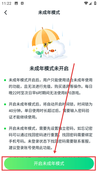 4、在未成年模式页面,点击【开启未成年模式】按钮,就能启用该模式,获得对应的使用限制保护啦。