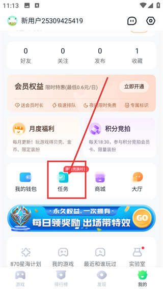 1、在游戏页点底部【我的】选项,能进入个人中心界面,后续可查看或参与任务等功能啦。