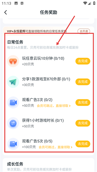 3、在任务奖励页能看到日常任务,像【玩任意云玩10分钟】这类任务,点去完成就能推进进度啦。