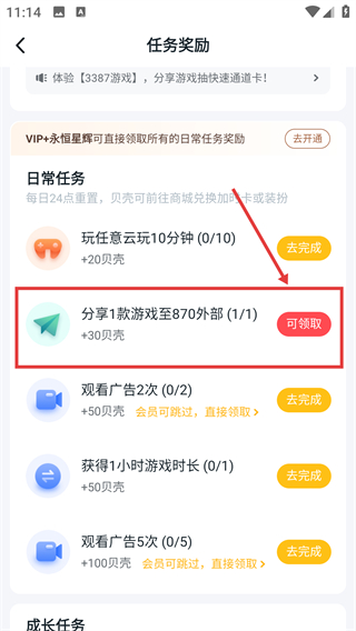 4、当任务完成后,像【分享1款游戏至870外部】会显示可领取,点按钮就能拿到对应的贝壳奖励啦。