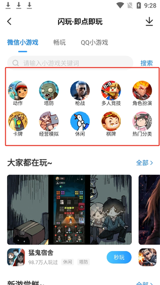 3、进入畅玩广场后,能看到【人气爆款】【新游上线】等板块,有《火力大开2》《火柴人战争:遗产》等多款游戏供我们选择。