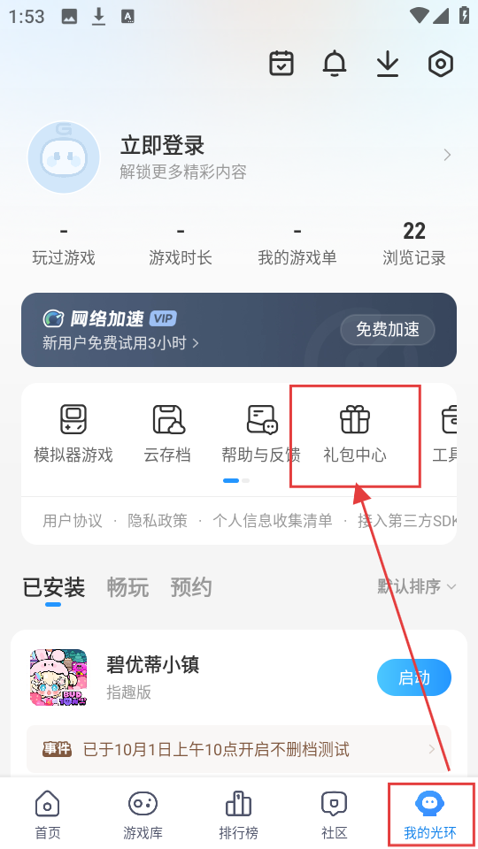 1、我们点击软件底部【我的光环】进入个人中心,能看到【礼包中心】选项,点击它就能进入礼包中心页面,去领取各类游戏礼包啦。