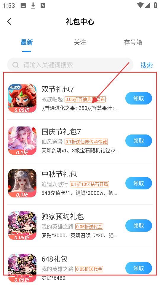 2、进入礼包中心后,能看到有【双节礼包7】【国庆节礼包7】等多款礼包,我们可选择想要领取的礼包。