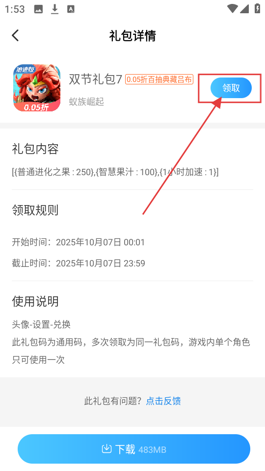 3、比如我们选择【双节礼包7】,进入礼包详情页,能看到礼包内容、领取规则等信息,然后点击【领取】按钮。