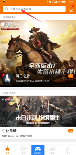 1、这里介绍一个精准下载自己喜欢游戏的方法,可以在精选的界面上方,输入自己想要下载的游戏。