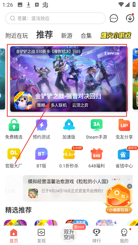 1、在软件首页,看到推荐的“金铲铲之战-强音对决回归”游戏,点击它就能进入游戏详情页面,了解更多信息啦。