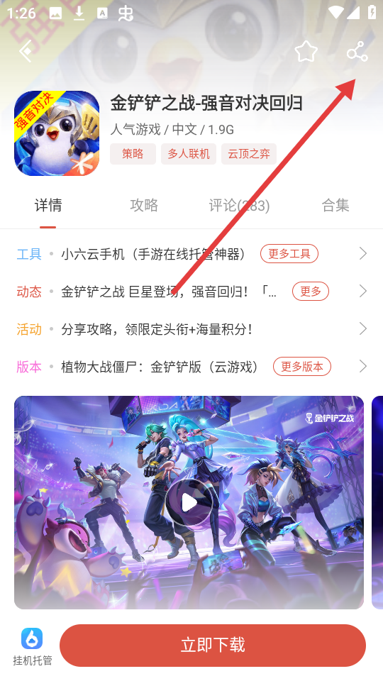 2、进入游戏详情页面后,若想分享游戏,就点击页面右上角的分享图标,这样就能打开分享选项啦。