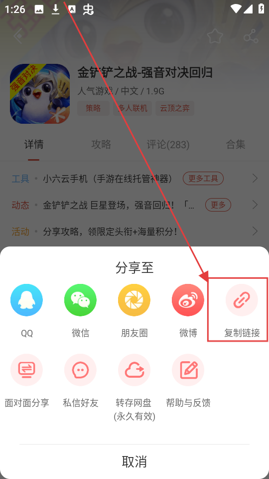 3、打开分享选项后,选择【复制链接】,就能把游戏链接复制下来,方便分享给他人啦。