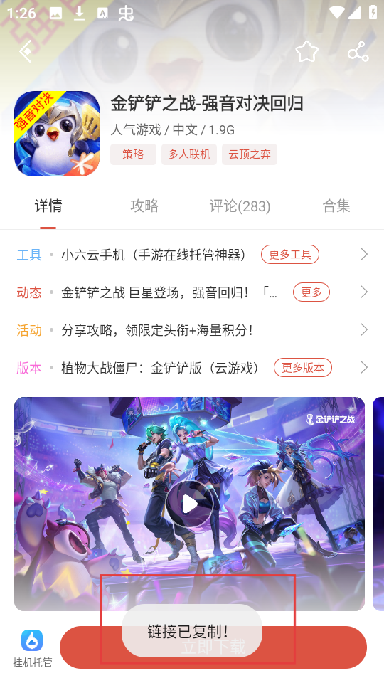 4、复制链接后,页面会提示“链接已复制”,这样就成功复制好游戏链接,可以去分享给朋友啦。
