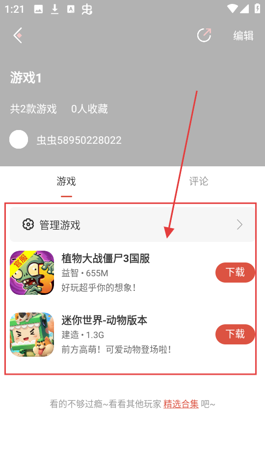 3、进入我的合集页面,能看到创建的合集,比如“游戏1”,点击它就能进入该合集的详情页面,查看里面的游戏啦。