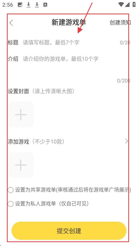 4、在新建游戏单页面,填写标题、介绍,设置封面,添加游戏,选择游戏单类型后,点击【提交创建】,即可完成游戏单创建啦。
