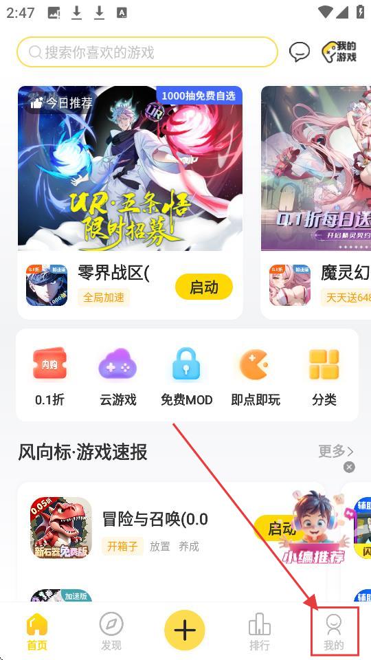 1、我们进入软件,若想进行游戏相关操作,点击底部【我的】,即可进入个人中心页面啦。