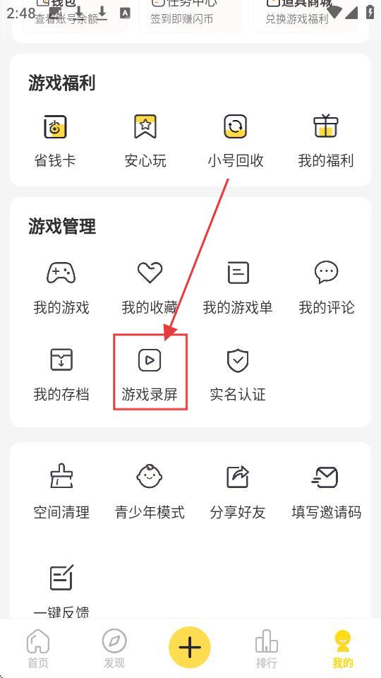 2、在个人中心页面,若想进行游戏录屏,点击【游戏录屏】,就能进入游戏录屏页面哦。