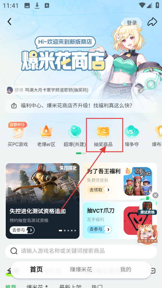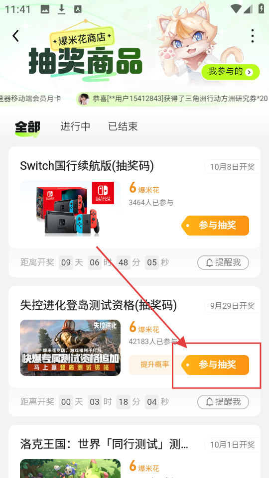 3、在抽奖商品页面,像《失控进化登岛测试资格》这类抽奖项目,点击【参与抽奖】按钮,就能参与抽奖啦。