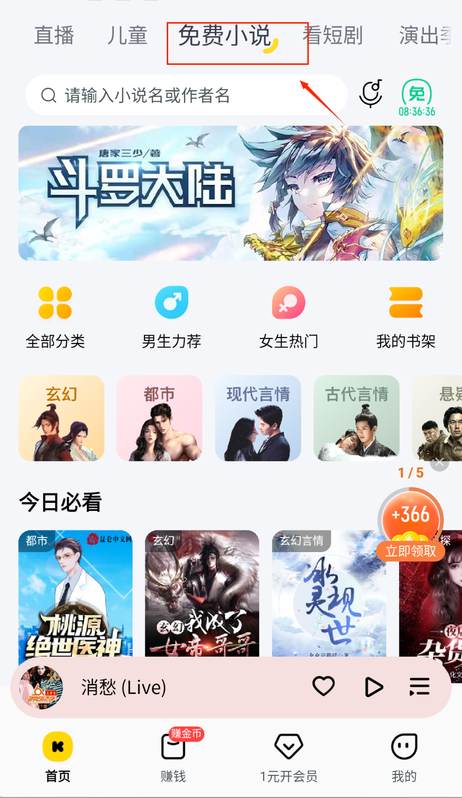 3、在“免费小说”页面中,系统按玄幻、都市、言情等分类推荐作品,你可以直接阅读今日必看内容,或者通过搜索查找特定小说。