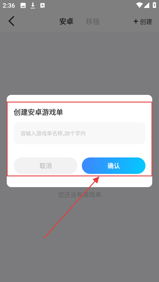 4、输入游戏单名称后,点击【确认】,就能成功创建安卓游戏单,超简单的呢。