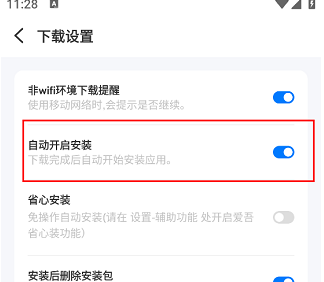 4、然后来到“下载设置”界面之后,就可以看到“自动开启安装”选项,最后将其右侧的开关按钮打开即可。