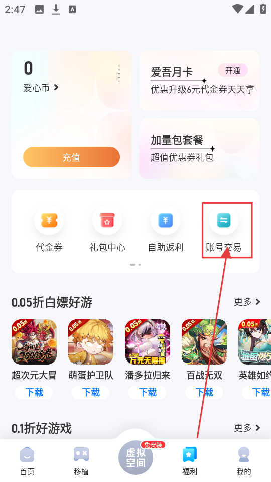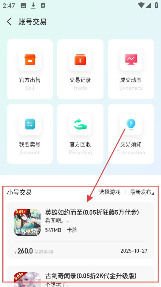 1、在“我的”页面,点击【账号交易】,可进入账号交易页面,查看账号交易相关功能哦。