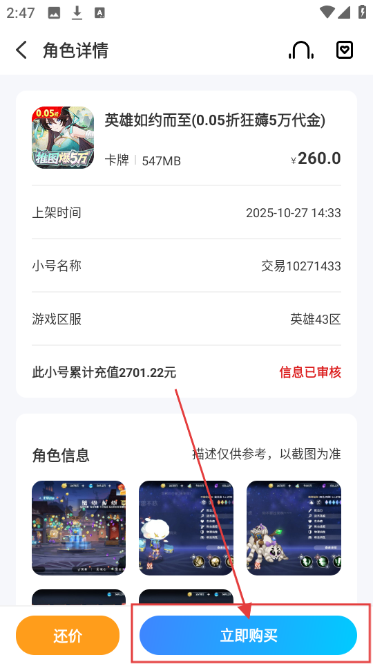 2、进入账号交易页面后,可看到小号交易列表,点击感兴趣的账号如【英雄如约而至】,可进入角色详情页啦。