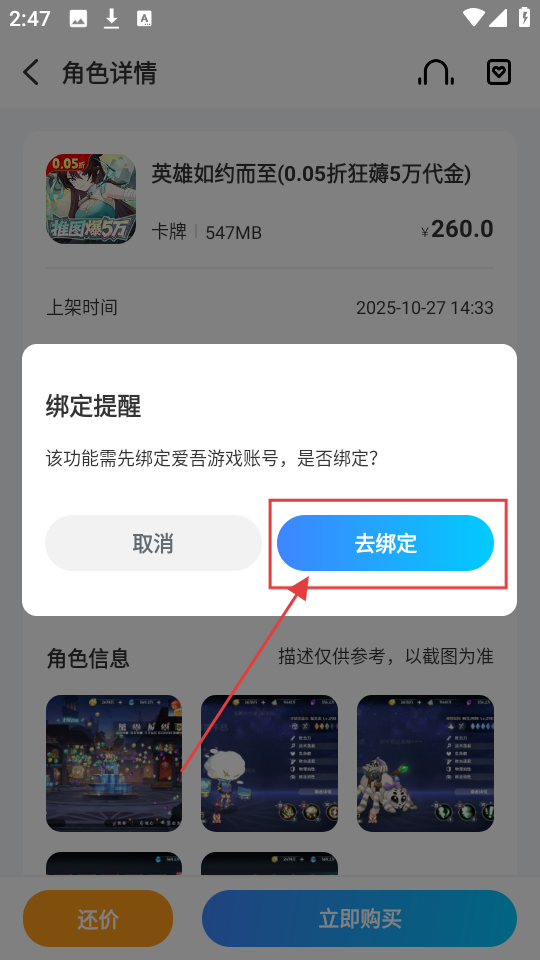3、在角色详情页,点击【立即购买】按钮,可触发绑定提醒弹窗,准备绑定账号哦。
