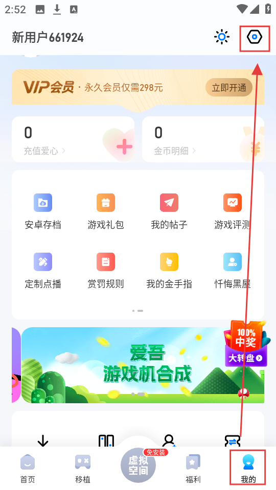 2、进入到“我的”板块中,需要找到并点击右上角的齿轮图标。