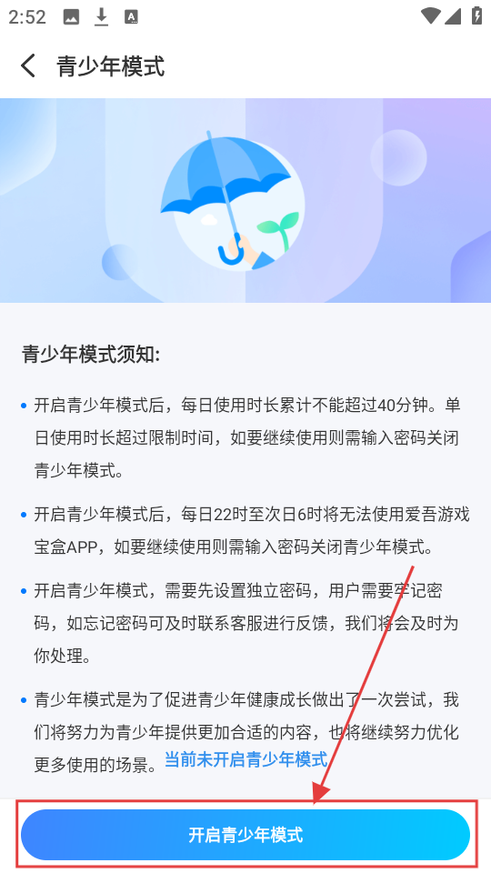 3、在青少年模式页面点击【开启青少年模式】,就能开始开启流程啦。