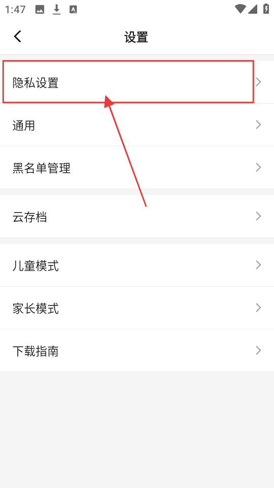 3、进入设置页面后,若想进行隐私相关设置,点击【隐私设置】选项。