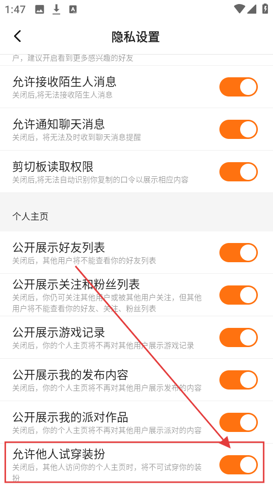 4、进入隐私设置页面后,可根据需要开启或关闭“允许他人试穿装扮”等隐私选项,方便保护个人隐私哦。