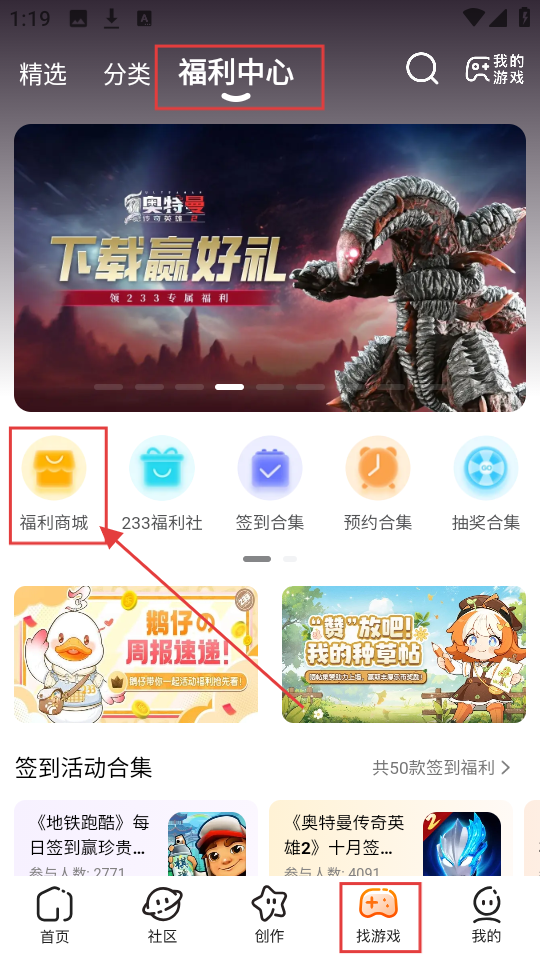 1、我们进入“找游戏”页面后,点击【福利中心】,再点击【福利商城】,就能进入福利商店页面啦。