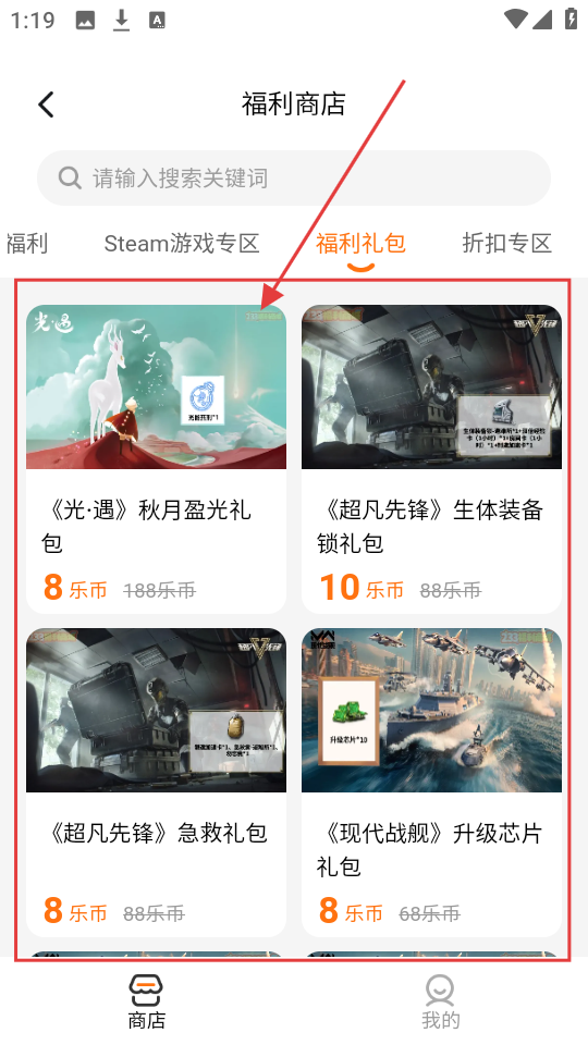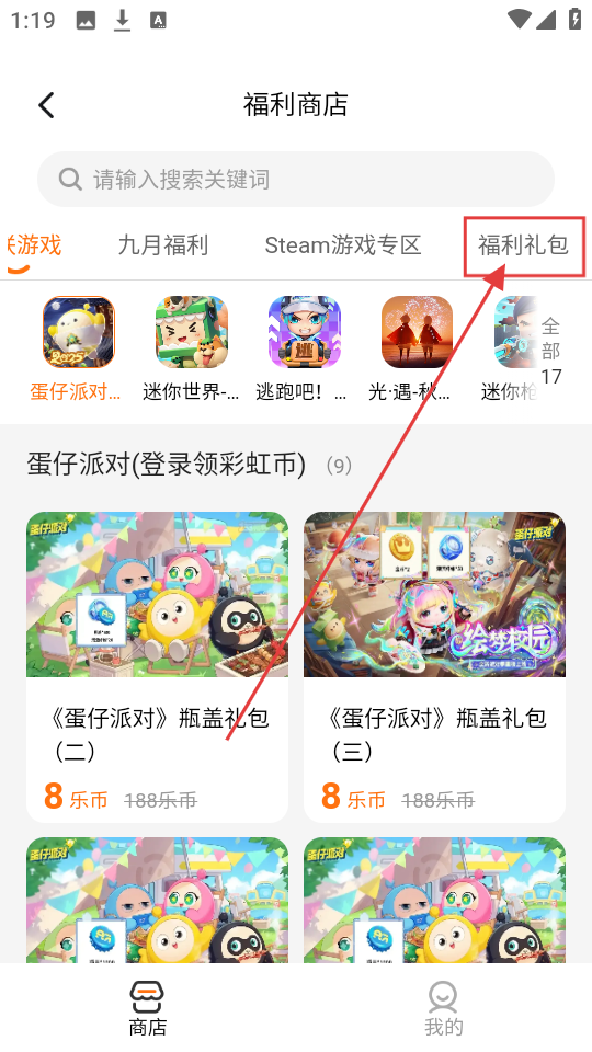2、进入福利商店后,我们点击【福利礼包】标签,就可以看到各类游戏的福利礼包啦。