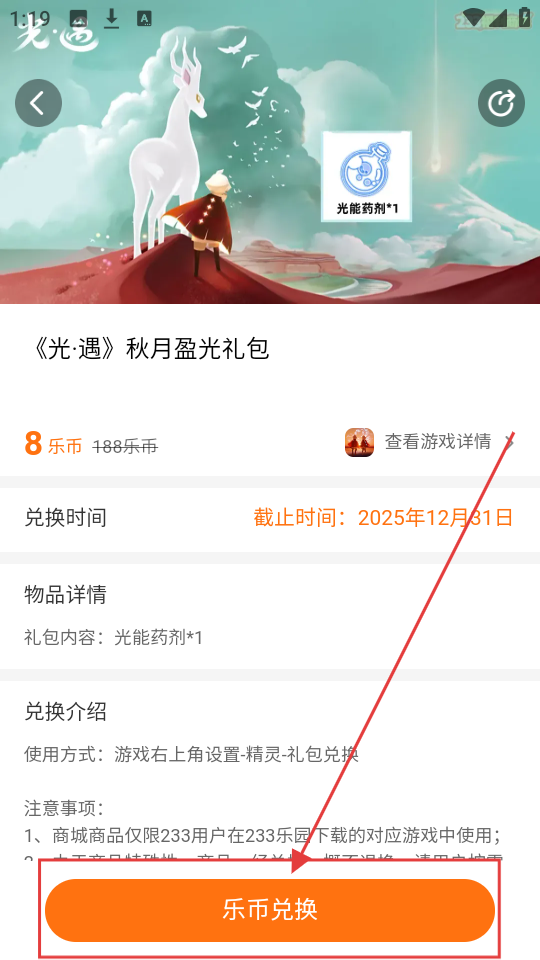 4、选好想要的礼包,比如《光·遇》秋月盈光礼包,点击【乐币兑换】,就可以用乐币兑换该礼包啦。