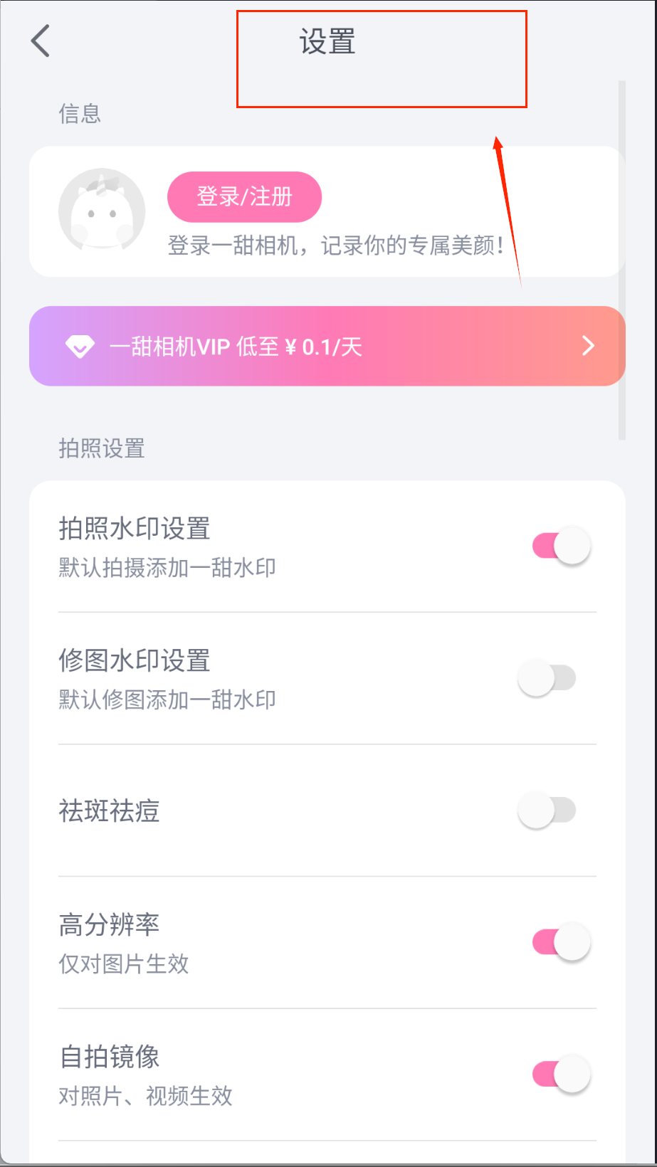2、在设置页面可以调整拍照偏好,比如开启或关闭默认水印功能,根据需求选择是否添加一甜水印。
