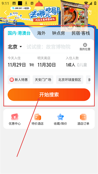 2、进入酒店预订页后,选好城市、日期和人数,点【开始搜索】就能查到对应条件的酒店列表哦。