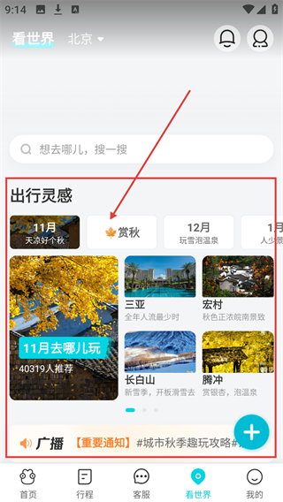 3、在“看世界”页,点【赏秋】标签能看到11月适合赏秋的目的地推荐,帮你找出行灵感呀。