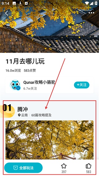 4、选推荐里的【腾冲】,点【全部玩法】能查看当地详细游玩攻略,规划你的秋日旅行行程哦。