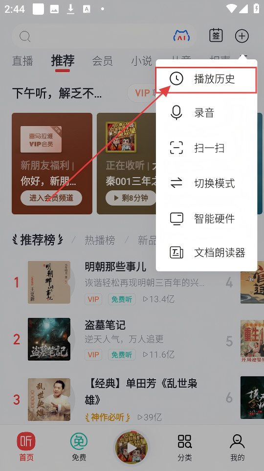 2、展开的菜单里有【播放历史】选项,点击可查看之前听过的内容,便于快速找到想听的。