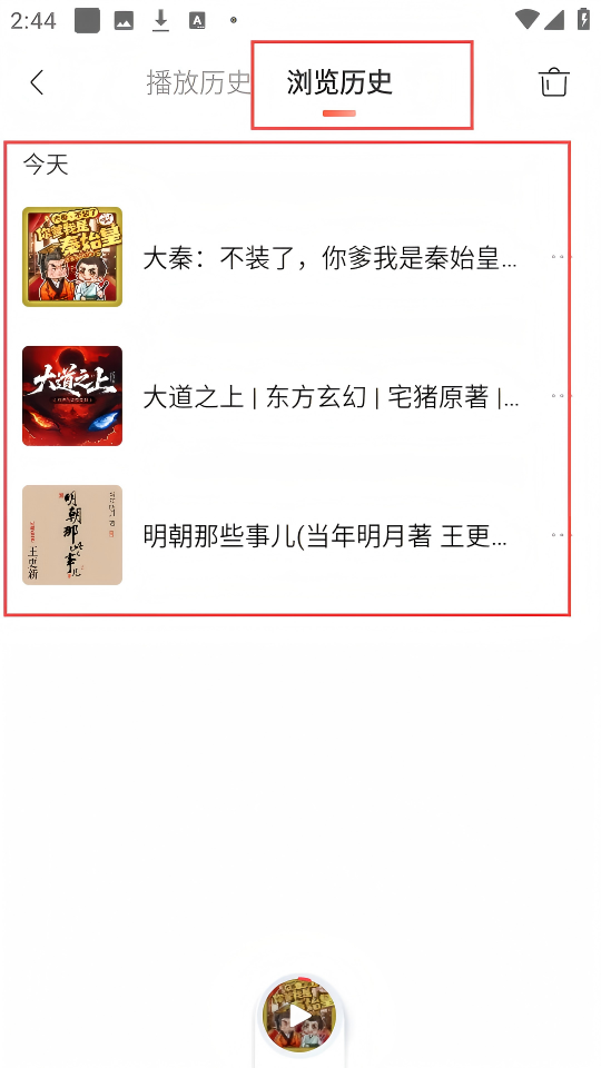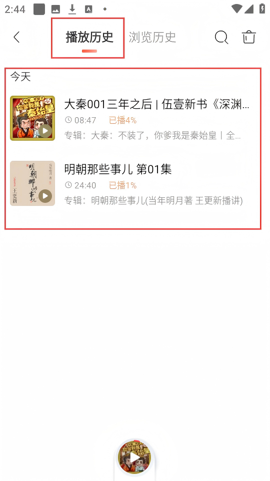 3、在播放历史页面,能看到今天听过的【大秦001三年之后】等内容,查找十分便捷。
