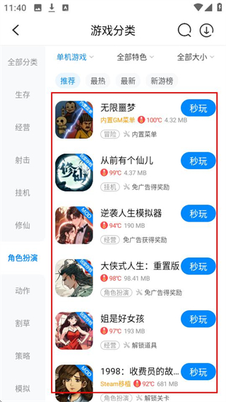 2、在游戏分类页面选择游戏品类,比如【单机游戏】,就能看到对应品类的游戏啦。